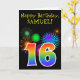 The front of this fun, vibrant birthday greeting card design features a colourful celebratory fireworks inspired pattern, along with the number "16" featuring a multicolored rainbow like gradient pattern, on a black coloured background. The front also features a birthday greeting message, including a customisable recipient name. The inside features a customisable birthday greeting message, or could perhaps be cleared and left blank if a message is to be written by hand instead. A customisable birthday card like this might be a fun way to send a message in celebration of somebody’s sixteenth birthday. [~Z0000330]