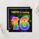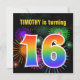 This fun, vibrant birthday party invitation design features a colourful pattern inspired by bursting celebratory fireworks, along with the number "16" featuring a multicolored rainbow like spectrum or gradient pattern. The name on the front can be personalised. The back features personalised information about the party. Birthday party invitations like this might be used to invite guests to a birthday party being held to celebrate somebody’s sixteenth birthday. [~Z0000337]
