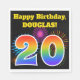 This fun, vibrant paper napkin design features a colourful pattern inspired by celebratory fireworks, along with the number "20" featuring a multicolored rainbow like gradient pattern, on a black coloured background. It also features a personalised name and event message. Paper napkins like this might be used at a birthday party being held to celebrate somebody’s twentieth birthday. [~Z0000326]
