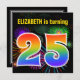 This fun, vibrant birthday party invitation design features a colourful bursting celebratory fireworks inspired pattern, along with the number "25" featuring a multicolored rainbow inspired spectrum or gradient pattern. The name on the front can be personalised. The back features personalised information about the party. Birthday party invitations like this might be used to invite guests to a birthday party being held to celebrate somebody’s twenty fifth birthday. [~Z0000337]