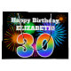 This fun, vibrant gift bag design features a colourful pattern inspired by celebratory fireworks, along with the number "30" having a multicolored rainbow like gradient pattern, on a black coloured background. It also features a custom name and event message, such as a birthday greeting. A colourful and joyful gift bag like this might be used when giving a gift or present to somebody who is celebrating their thirtieth birthday. [~Z0000328]