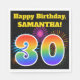 This fun, vibrant paper napkin design features a colourful celebratory fireworks inspired pattern, along with the number "30" featuring a multicolored rainbow like gradient pattern, on a black coloured background. It also features a custom name and event message. Paper napkins like this could perhaps be used at a party being held to celebrate somebody’s thirtieth birthday. [~Z0000326]