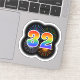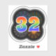 This fun, vibrant sticker design features a colourful bursting celebratory fireworks inspired pattern, along with the number "32" having a multicolored rainbow like spectrum or gradient pattern. A fun sticker like this might be used when celebrating somebody’s thirty second birthday, or perhaps a couple’s thirty second wedding anniversary, or some other 32nd event. [~Z0000362]