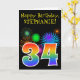 The front of this fun, vibrant birthday greeting card design features a colourful celebratory fireworks inspired pattern, along with the number "34" featuring a multicolored rainbow inspired gradient pattern, on a black coloured background. The front also features a birthday greeting message, including a customised recipient name. The inside features a customised birthday greeting message, or could perhaps be cleared and left blank if a message is to be written by hand instead. A personalised birthday card like this might be a fun way to acknowledge somebody’s thirty fourth birthday. [~Z0000330]