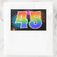 This fun, vibrant sticker design features a colourful pattern inspired by celebratory fireworks, along with the number "45" having a multicolored rainbow inspired gradient pattern, on a black coloured background. Stickers like this might be used at a party celebrating somebody’s forty fifth birthday, or perhaps for a couple’s forty fifth wedding anniversary, or some other 45th event. [~Z0000324]