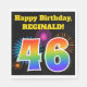 This fun, vibrant paper napkin design features a colourful pattern inspired by celebratory fireworks, along with the number "46" featuring a multicolored rainbow like gradient pattern, on a black coloured background. It also features a personalised name and event message. Paper napkins like this might be used at a party being held to celebrate somebody’s forty sixth birthday. [~Z0000326]