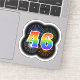 This fun, vibrant sticker design features a colourful pattern inspired by bursting celebratory fireworks, along with the number "46" having a multicolored rainbow inspired spectrum or gradient pattern. A sticker like this might perhaps be used when celebrating somebody’s forty sixth birthday, or perhaps a couple’s forty sixth wedding anniversary, or some other 46th event. [~Z0000362]