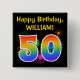 This fun, vibrant button design features a colourful bursting celebratory fireworks inspired pattern, along with the number "50" featuring a multicolored rainbow like spectrum or gradient pattern. It also features a customisable name and event message, such as a "Happy Birthday" birthday greeting. A button like this might be worn by the guests at a birthday party being held to celebrate somebody’s fiftieth birthday. [~Z0000334]