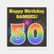 This fun, vibrant paper napkin design features a colourful celebratory fireworks inspired pattern, along with the number "50" having a multicolored rainbow like gradient pattern, on a black coloured background. It also features a customisable name and event message. Paper napkins like this could perhaps be used at a party being held to celebrate somebody’s fiftieth birthday. [~Z0000326]