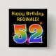 This fun, vibrant button design features a colourful pattern inspired by bursting celebratory fireworks, along with the number "52" having a multicolored rainbow inspired spectrum or gradient pattern. It also features a personalised name and event message, such as a "Happy Birthday" birthday greeting. A button like this might be worn by the guests at a birthday party being held to celebrate somebody’s fifty second birthday. [~Z0000334]