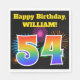 This fun, vibrant paper napkin design features a colourful pattern inspired by celebratory fireworks, along with the number "54" featuring a multicolored rainbow inspired gradient pattern, on a black coloured background. It also features a customisable name and event message. Paper napkins like this might be used at a party being held to celebrate somebody’s fifty fourth birthday. [~Z0000326]