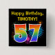 This fun, vibrant button design features a colourful pattern inspired by bursting celebratory fireworks, along with the number "57" having a multicolored rainbow like spectrum or gradient pattern. It also features a custom name and event message, such as a "Happy Birthday" birthday greeting. A button like this might be worn by the attendees at a birthday party being held in celebration of somebody’s fifty seventh birthday. [~Z0000334]