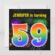 This fun, vibrant birthday party invitation design features a colourful bursting celebratory fireworks inspired pattern, along with the number "59" having a multicolored rainbow inspired spectrum or gradient pattern. The name on the front can be personalised. The back features personalised information about the party. Birthday party invitations like this might be sent to potential guests for a birthday party being held to celebrate somebody’s fifty ninth birthday. [~Z0000337]