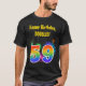This fun, vibrant shirt design features a colourful pattern inspired by bursting celebratory fireworks, along with the number "59" having a multicolored rainbow like spectrum or gradient pattern. It also features a customisable name and event message, such as a "Happy Birthday" birthday greeting. A shirt like this might be worn by the guests at a birthday party being held in celebration of somebody’s fifty ninth birthday. [~Z0000332]