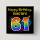 This fun, vibrant button design features a colourful pattern inspired by bursting celebratory fireworks, along with the number "61" having a multicolored rainbow like spectrum or gradient pattern. It also features a customisable name and event message, such as a "Happy Birthday" birthday greeting. A button like this might be worn by the guests at a birthday party being held to celebrate somebody’s sixty first birthday. [~Z0000334]