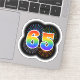 This fun, vibrant sticker design features a colourful bursting celebratory fireworks inspired pattern, along with the number "65" featuring a multicolored rainbow inspired spectrum or gradient pattern. A sticker like this might be fun to use when celebrating somebody’s sixty fifth birthday, or perhaps a couple’s sixty fifth wedding anniversary, or some other 65th event. [~Z0000362]