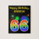This fun, vibrant puzzle design features a colourful pattern inspired by celebratory fireworks, along with the number "66" having a multicolored rainbow like gradient pattern, on a black coloured background. It also features a personalised name and event message, such as a birthday greeting. A puzzle like this might be a fun way to send a birthday message to acknowledge somebody’s sixty sixth birthday. [~Z0000329]