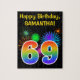 This fun, vibrant puzzle design features a colourful pattern inspired by celebratory fireworks, along with the number "69" featuring a multicolored rainbow inspired gradient pattern, on a black coloured background. It also features a personalised name and event message, such as a birthday greeting. A puzzle like this might be a fun way to send a greeting message in celebration of somebody’s sixty ninth birthday. [~Z0000329]