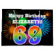 This fun, vibrant gift bag design features a colourful celebratory fireworks inspired pattern, along with the number "69" featuring a multicolored rainbow like gradient pattern, on a black coloured background. It also features a personalised name and event message, such as a birthday greeting. A colourful gift bag like this might be used when wrapping a gift or present that is being given in celebration of somebody’s sixty ninth birthday. [~Z0000328]