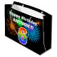This fun, vibrant gift bag design features a colourful pattern inspired by celebratory fireworks, along with the number "6" featuring a multicolored rainbow inspired gradient pattern, on a black coloured background. It also features a personalised name and event message, such as a birthday greeting. A colourful gift bag like this might be used when wrapping a gift or present that is being given in celebration of somebody’s sixth birthday. [~Z0000328]