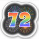 This fun, vibrant sticker design features a colourful pattern inspired by bursting celebratory fireworks, along with the number "72" featuring a multicolored rainbow inspired spectrum or gradient pattern. A fun sticker like this might be fun to use when celebrating somebody’s seventy second birthday, or perhaps a couple’s seventy second wedding anniversary, or some other 72nd event. [~Z0000362]