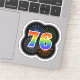 This fun, vibrant sticker design features a colourful bursting celebratory fireworks inspired pattern, along with the number "76" featuring a multicolored rainbow inspired spectrum or gradient pattern. A fun sticker like this might perhaps be used when celebrating somebody’s seventy sixth birthday, or perhaps a couple’s seventy sixth wedding anniversary, or some other 76th event. [~Z0000362]