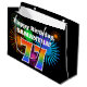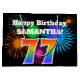 This fun, vibrant gift bag design features a colourful celebratory fireworks inspired pattern, along with the number "77" featuring a multicolored rainbow inspired gradient pattern, on a black coloured background. It also features a personalised name and event message, such as a birthday greeting. A colourful and joyful gift bag like this might be used when giving a gift or present to somebody who is celebrating their seventy seventh birthday. [~Z0000328]