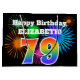 This fun, vibrant gift bag design features a colourful celebratory fireworks inspired pattern, along with the number "79" featuring a multicolored rainbow inspired gradient pattern, on a black coloured background. It also features a custom name and event message, such as a birthday greeting. A gift bag like this might be used to wrap a present or gift being given in celebration of somebody’s seventy ninth birthday. [~Z0000328]