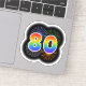 This fun, vibrant sticker design features a colourful pattern inspired by bursting celebratory fireworks, along with the number "80" featuring a multicolored rainbow like spectrum or gradient pattern. A sticker like this might be used when celebrating somebody’s eightieth birthday, or perhaps a couple’s eightieth wedding anniversary, or some other 80th event. [~Z0000362]