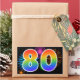 This fun, vibrant sticker design features a colourful pattern inspired by celebratory fireworks, along with the number "80" featuring a multicolored rainbow inspired gradient pattern, on a black coloured background. Stickers like this might be used at a party celebrating somebody’s eightieth birthday, or perhaps for a couple’s eightieth wedding anniversary, or some other 80th event. [~Z0000324]