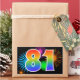 This fun, vibrant sticker design features a colourful pattern inspired by celebratory fireworks, along with the number "81" featuring a multicolored rainbow inspired gradient pattern, on a black coloured background. Stickers like this might be used at a party celebrating somebody’s eighty first birthday, or perhaps for a couple’s eighty first wedding anniversary, or some other 81st event. [~Z0000324]