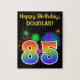 This fun, vibrant puzzle design features a colourful pattern inspired by celebratory fireworks, along with the number "85" featuring a multicolored rainbow like gradient pattern, on a black coloured background. It also features a personalised name and event message, such as a birthday greeting. A puzzle like this might be a fun way to send a greeting message to celebrate somebody’s eighty fifth birthday. [~Z0000329]