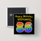 This fun, vibrant button design features a colourful pattern inspired by bursting celebratory fireworks, along with the number "86" having a multicolored rainbow inspired spectrum or gradient pattern. It also features a personalised name and event message, such as a "Happy Birthday" birthday greeting. A button like this might be worn by the attendees at a birthday party being held in celebration of somebody’s eighty sixth birthday. [~Z0000334]