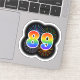 This fun, vibrant sticker design features a colourful bursting celebratory fireworks inspired pattern, along with the number "89" featuring a multicolored rainbow inspired spectrum or gradient pattern. A fun sticker like this might be used when celebrating somebody’s eighty ninth birthday, or perhaps a couple’s eighty ninth wedding anniversary, or some other 89th event. [~Z0000362]