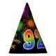 This fun, vibrant birthday party hat design features a colourful pattern inspired by bursting celebratory fireworks, along with the number "92" featuring a multicolored rainbow like spectrum or gradient pattern. It also features a personalised name and event message, such as a "Happy Birthday" birthday greeting. A birthday-themed paper hat like this might be worn by the guests at a birthday party being held to celebrate somebody’s ninety second birthday. [~Z0000333]