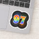 This fun, exciting sticker design features a colourful pattern inspired by bursting celebratory fireworks, along with the number "97" featuring a multicolored rainbow inspired spectrum or gradient pattern. A fun sticker like this might be used when celebrating somebody’s ninety seventh birthday, or perhaps a couple’s ninety seventh wedding anniversary, or some other 97th event. [~Z0000362]