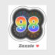 This fun, vibrant sticker design features a colourful pattern inspired by bursting celebratory fireworks, along with the number "98" having a multicolored rainbow like spectrum or gradient pattern. A fun sticker like this might perhaps be used when celebrating somebody’s ninety eighth birthday, or perhaps a couple’s ninety eighth wedding anniversary, or some other 98th event. [~Z0000362]