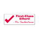 This positive rubber stamp design features the praise message "First-Class Effort!" and a customised educator's name. It also features a decorative checkmark icon. It could be used by a school teacher, educator, instructor, or tutor when grading student work, to acknowledge that a student has done an exceptional job.