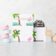 Hot pink fun flamingo standing in a puddle of water. There's a palm tree with a toucan in it. Personalise with Birthday child's name and age.