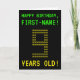 The front of this nerdy, editable birthday card design features the messages "HAPPY BIRTHDAY" and "9 YEARS OLD!", along with a customisable recipient name. The messages on the front have an appearance inspired by pixelated classic video games. The number "9" on the front is itself made up of smaller sized "9" digits, giving an ASCII art inspired look. The inside features a birthday greeting message that can be personalised. A geeky style, personalised birthday greeting card like this might be a special way to send birthday wishes to somebody celebrating their ninth birthday. [~Z0000366]