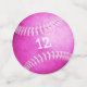 This cute softball birthday party confetti features the realistic image of a softball that has been recolored hot pink with white stitching on the front and back of each confetti piece, upon which you can customise the text - by katz_d_zynes