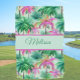 This custom ladies personalized golf towel features green and pink palm trees with a customizable name on a green background. It's a stylish, cute gift for a golfer. It's a useful present for your mom, sister, grandma, or any lady whose hobby is playing golf, or who lives in Florida or another tropical climate.