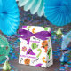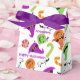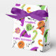 This is a fun Halloween favour box with candy, pumpkins and witch's hats on a white background. The favour box can be personalised by changing the name on the box and the text. It can be given at parties, or corporate events.