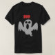 This design features a grey ghost with a slightly creepy yet funny facial expression, with black eyes and an oval-shaped mouth, spelling out the word "BOO!" written at the top of the design in large red font with a striking white border. The background is all black, adding a mysterious and Halloween-worthy atmosphere. The design has a fun and simple feel, making it perfect for Halloween cards or festive decorations.