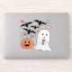 A fun Halloween sticker pack featuring a cute ghost , some jack-o-lanterns , a few bats and some typography .