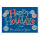 A fun, text-based Happy Holidays card 'From Our Home to Yours', with Ornaments and Lettering, filled with red, blue and green chevrons and polka dots, outline in white on a bright blue background. There is also a custom front card with this design in case you can't find a card for the specific recipient you're looking for.