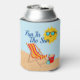 Nothing says summer fun like a day at the. This Can Cooler features a cosy beach chair, in the sand along with a pail and shovel. Above the whimsical sun, in sunglasses. The text reads "Fun In The Sun". The same image is on the front and back. On the bottom of the can cooler there is an image of the sun.