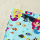 Cute beach towel for a girl with colourful mermaids & fish set on a blue background.  Easy to personalise with your name!