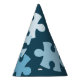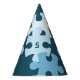 The Fun Jigsaw Puzzle Kids' 5th Birthday Blue Party Hat features blue jigsaw puzzle pieces. There is a placeholder in the center for the birthday boy or girl's age. All elements are customizable by color.
