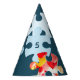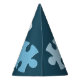 The Fun Jigsaw Puzzle Kids' 5th Birthday Party Hat features blue jigsaw puzzle pieces. One piece has an accent image or custom theme party image for a personal touch. There is a placeholder in the center for the birthday boy or girl's age. All elements are customizable by color.